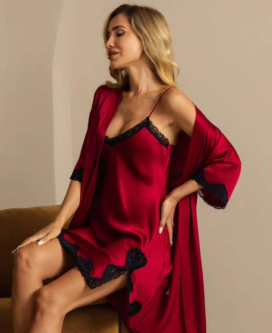 Elegant Ren Silke Morgenkåpe Og Camisole Set Med Blondedetaljer 3 Deler
