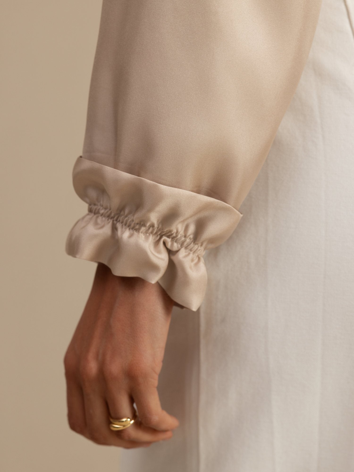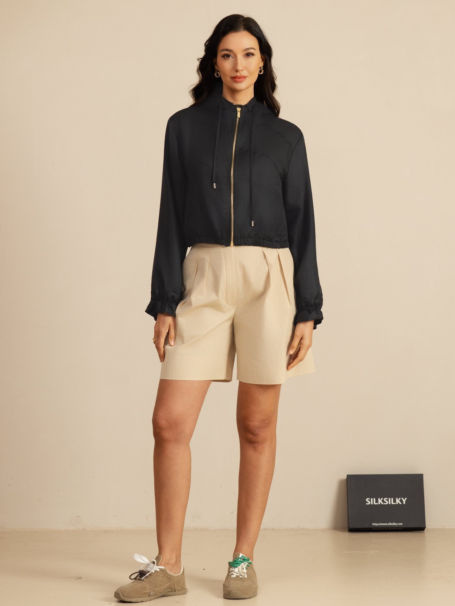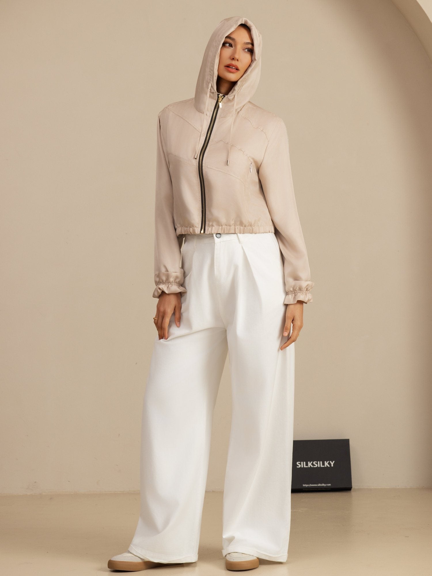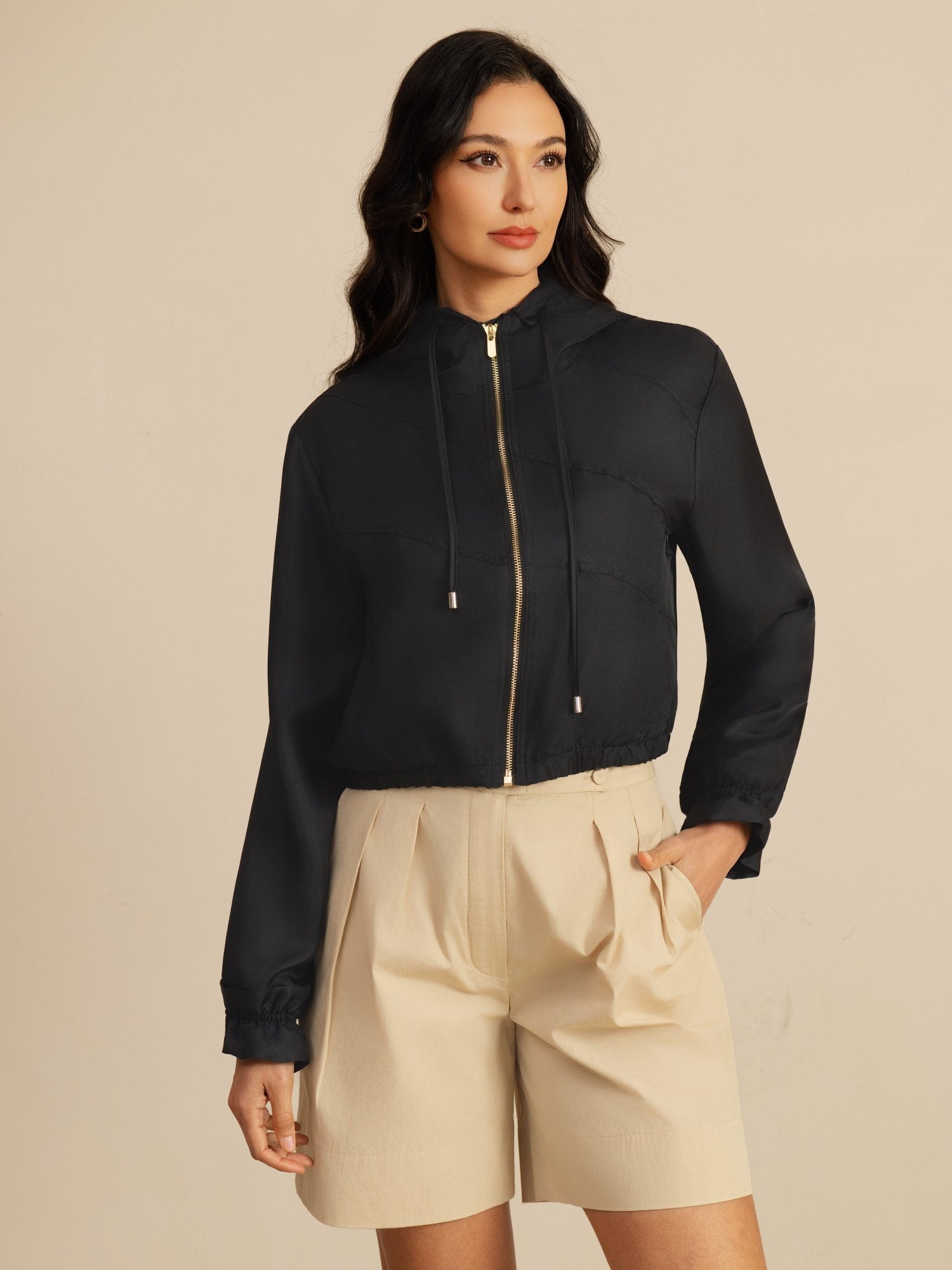 Laget av 18Momme silk satin surah, kombinerer denne hettejakken eleganse med sporty funksjonalitet. Hette med høy hals og justerbar snor gir tilpasset dekning, mens elastisk midje og kort croppet lengde flatterer silhuetten. Rysjekanter på ermene gir et subtilt feminint preg, og sidelommer gir praktisk oppbevaring. Lett og myk, perfekt for uformelle turer eller aktivitet, og gir enkel stil og komfort i hverdagen.