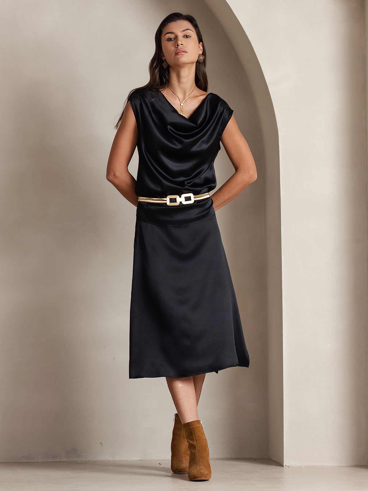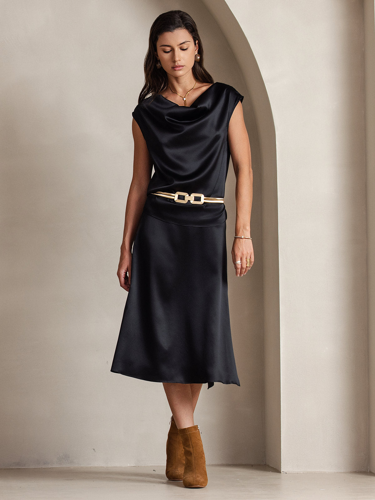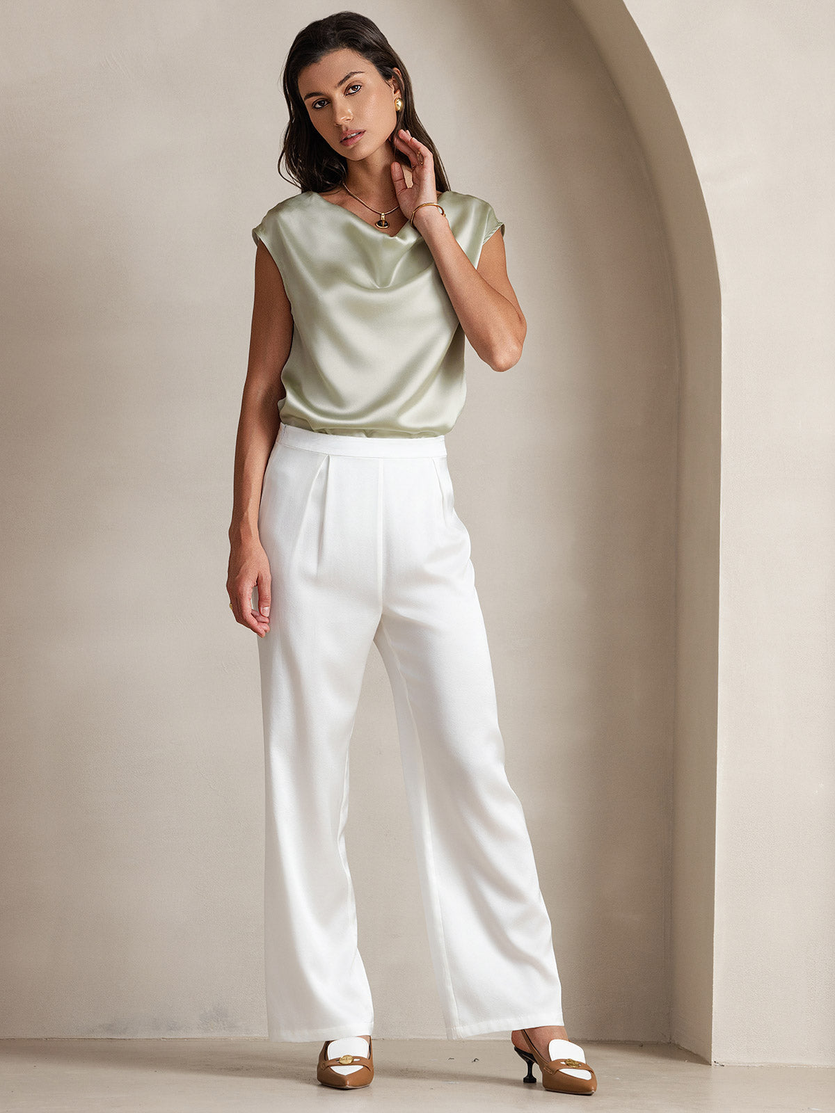 I wore the silver a black suit and it set the suit off perfectly. Oh yes, I recommend this silk top for sure. The colors are so pretty.